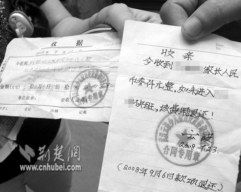 據學生家長易女士介紹,她家住漢口頭道街,小孩今年剛剛讀初一。一年前,孩子讀六年級的時候,她在家附近的“武漢博淵培優公司”給孩子補習數學。7月12日,小孩回家后告訴她說,培優老師稱他在附近的中學有關系,可以介紹學生進快班,不過要收取3000元錢。于是,易女士交給了培優老師3000元錢,并拿到了一張收條。收錢方承諾,進不了快班就退錢,落款名為“云波”。