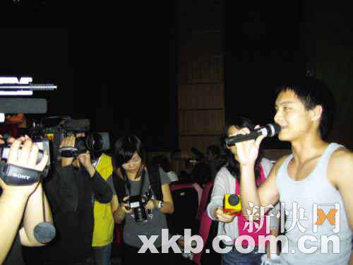 可惜,千呼萬喚之下“提問者”仍不肯露面。突然,一名欲發言的“局外”男生把手舉得老高,他還沒來得及發言,已被攝像搶、閃光燈“重重包圍”。