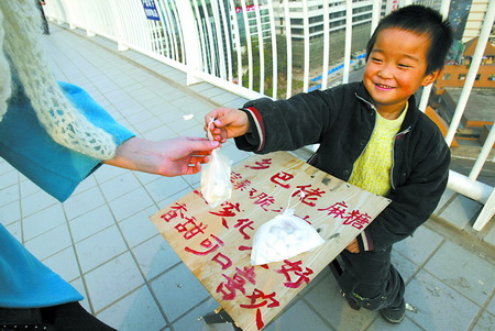 昨天下午3點,菜園壩長江大橋人行道上,一名小男孩坐在小板凳上,他面前的小攤上,擺著一袋袋麻糖。“我賣的麻糖很甜。”小男孩笑著兜售。有顧客彎腰,問他幾歲了,小男孩笑著回答:“我6歲半了,讀一年級,麻糖1元一袋。”有中年女士帶著10多歲的女兒走過,給女兒掏錢買麻糖,并教育女兒道:“你看人家這么小,就開始做生意了。”