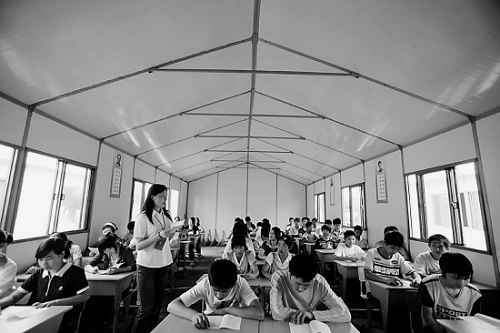 昨天一大早,14歲的王柱良背著書包重新回到了崇州何家中學的課堂。與其他重災區的受損學校不同,這所抗震中學用的不是帳篷,而是花了一天時間搭建起來的彩鋼復合夾心板房子。