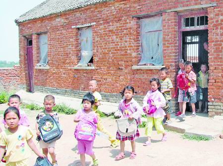 “學(xué)校只有一棟兩層只能容納8個(gè)班的教學(xué)樓,學(xué)前班和一至六年級(jí)占去7個(gè)教室,多媒體遠(yuǎn)程教 室和辦公室合占一個(gè)教室。幼兒班的34個(gè)孩子沒處上課,晴天就在 3間破瓦房里湊合,雨天就停課!标惡S窭蠋熣f。幼兒班上課的3間破瓦房,房頂明顯下陷,破舊的教室門上橫七豎八地釘著幾個(gè)木板擋住窟窿,窗戶上已經(jīng)沒有玻璃,墻體上多處有明顯裂縫!昂⒆釉诶锩嫔险n太嚇人了。”在該校門口,前來接孫子的73歲老人李繼剛說,“房子是上世紀(jì)70年代末蓋的,娃子在里面上課,家長(zhǎng)天天擔(dān)心。”