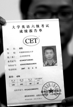 記者謊稱急找工作需要六級證書,以300元辦了一張不能查分的六級證。4天后,記者如期拿到假證,仔細對照了印章、字體、紙質(zhì)、照片,甚至是防偽水印,幾乎看不出其與真證的差別。(彭欣 實習生吳少鋒)
