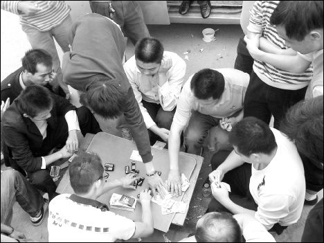 湖北第二師范學院門口,許多人擺攤子玩牌九。記者施政 攝