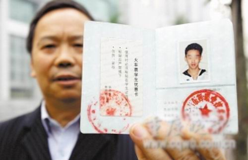 王輝的外公拿著學生證,證明他是在校學生記者 楊帆 攝