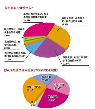 昨日上午,在“90后非主流現象”多項調查中,對于90后非主流現象的形成,有60%的網友認為主要是受社會和家庭影響。