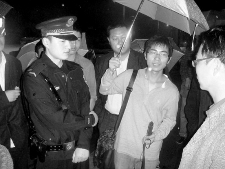 “下午2點20分左右,距比賽開始僅僅剩下40分鐘了,賽場內前奏的音樂已經響起,這時‘米黃外套’回來終于告訴大家,由于此次用的是賽車場發給上海市中學生的團體票,大學生不能入場,所以今天可能‘沒戲了’。此時九陽旅行社的洪經理看起來也焦頭爛額,他沒有打傘,站在大雨里,水珠不斷順著頭發流下!