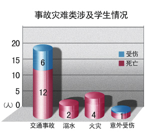 交通事故 2008年發(fā)生的10起交通事故中,5起發(fā)生在外地,分別系學(xué)生自行外出旅游、寒暑假返鄉(xiāng)等途中遭遇車禍,共造成7人死亡;另有5起為學(xué)生在本市校外社會(huì)道路上遭遇車禍,造成5人死亡。