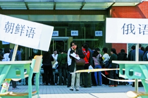 二外今年8個小語種專業計劃招收102人,昨日報名現場吸引來2300余名家長和學生,F場,一位家長拿著計算器核算一番后,決定替孩子報考朝鮮語,“這個專業報考的人少,分數自然不會太高!
