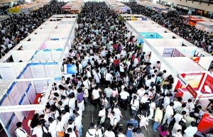據(jù)介紹,此次共吸引了600多家用人單位參展,提供了5000余個職位,主要涉及工程技術(shù)、電子、銷售、人力資源以及制造業(yè)等。其中,不乏中國人壽、百盛、北大青鳥、聯(lián)想、百度、大中等知名企業(yè)。在舉行招聘會的國展2、3、4號館里,應(yīng)聘者人頭攢動,水泄不通,主辦方為了保證三個展館內(nèi)的正常運行還進行了暫時的人流控制和疏導(dǎo)。截至昨天11時,招聘會已吸引了近2萬名求職者。