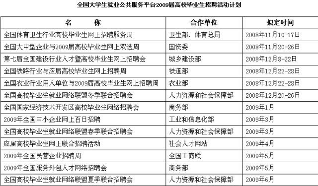 中新網(wǎng)10月28日電 2008年11月至2009年6月期間,全國大學(xué)生就業(yè)公共服務(wù)立體化平臺(tái)(新職業(yè))<>將組織舉辦13場專場網(wǎng)絡(luò)招聘會(huì)。