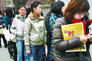 本報(bào)訊 今天上午9時(shí),2009年女大學(xué)生專場(chǎng)招聘會(huì)在位于德勝門的北京畢業(yè)生就業(yè)市場(chǎng)舉行。離招聘會(huì)開始還有半小時(shí),門前卻已蜿蜒排起了幾百米的長隊(duì)。截止記者發(fā)稿時(shí),應(yīng)聘學(xué)生已突破了四千人。