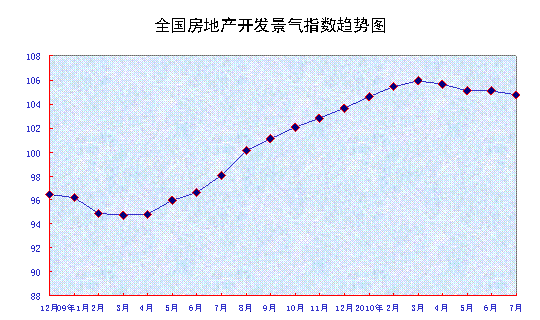 中新網8月10日電 據國家統計局網站消息,7月份,全國房地產開發景氣指數(簡稱“國房景氣指數”)為104.72,比6月份回落0.34點,比去年同期提高6.71點。