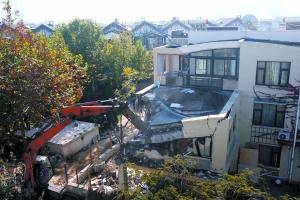 昨日,亦莊一棟洋房社區內一棟別墅的違建部分被城管部門強拆。本報記者 吳江 攝