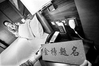 前天下午,記者在北京康源瑞廷酒店內看到,工作人員將一張寫有祝愿考生“金榜題名”字樣的卡片擺放在床鋪和床頭柜等明顯位置,使得房客一進門就能看到。