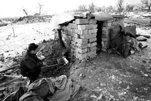 昨日中午,青磚窩棚在廢墟的白雪包圍下,冒起炊煙,崔存玲在一個(gè)缸子里烤起饅頭,準(zhǔn)備著和丈夫的午飯。