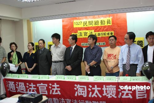 臺(tái)灣“民間推動(dòng)法官法行動(dòng)聯(lián)盟”十月二十五日召開(kāi)記者會(huì)宣布,將于十月二十七日在臺(tái)北中正紀(jì)念堂前廣場(chǎng)發(fā)動(dòng)“我要法官法”大游行。組織者說(shuō),很多人進(jìn)法院是要追求公平正義,但卻因不良的法官,受到再次傷害,法官法法案中最重要的就是法官的淘汰機(jī)制。在臺(tái)灣, 法官法已推動(dòng)十幾年,至今尚未通過(guò)。中新社發(fā) 耿軍 攝