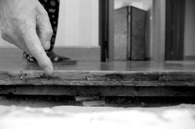 “距我們反映主衛(wèi)門框下面滲水、造成主臥的地板部分褪色、門框底框腐爛、門套底部貼面有氣泡突起、地磚大面積發(fā)黃這些問題已經一個月了。有人來看過也說是‘防水沒做好’,但沒單位負起這個責,徹底解決這件事,只是互相推諉。作為弱勢群體的我們只能不停地反映、等待。現(xiàn)在被挖開的地方,每天都會有小蟲爬出來。哎,花600多萬買的房子,浴缸卻只能看不能用。 ”陳老先生的老伴邊說邊指著旁邊畚箕里她掃出來的黑色小蟲子。對此,物業(yè)部門也派人檢查了好幾次。