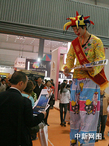 在房交會現場,房地產開發商們為吸人眼球,使盡渾身解數攬客。禮儀小姐舉著牌子,打著樓盤的廣告語,滿場游行;馬戲團小丑、美女模特站在展臺門口派發傳單;衣著印有樓盤信息T恤衫的促銷人員,四處游說和宣傳,為自己的展臺吸引人氣……