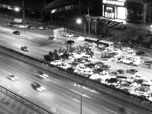 事發(fā)惠新東橋與望和橋之間的北四環(huán)外環(huán)主路!八沫h(huán)上全是車,生生被一座人墻給截住了!鼻巴10時許,芍藥居北里的雷先生在自家陽臺看到了這樣的場景。他介紹,當(dāng)時有數(shù)十人站在北四環(huán)53號小營路出口旁,將東向西主路的五條車道幾乎全部堵死。五分鐘內(nèi),上百輛經(jīng)過此地的轎車、機(jī)場巴士和商務(wù)客車被攔截在他們面前,喇叭聲和叫嚷聲不時響起。幾名司機(jī)下車?yán)碚摵螅巳鹤尦隽俗顑?nèi)側(cè)一條車道,車流緩慢通行。