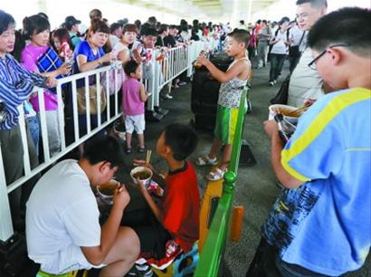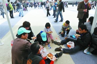 鴨脖子、雞爪、雞翅、黃瓜、雞蛋、面包……下午五點多,記者在園區看到,不少游客一家人攤開折疊椅,拿出包內的食物開始野餐。沒吃一會,女主人又買來4支冰激凌和若干串烤肉,一家人邊啃烤肉邊吃冰激凌,非常開心。 “我們一家人從江西南昌過來,早就聽說世博園內到處都要排隊,所以索性從家里帶了點吃的東西過來,主要是為了節約排隊用餐時間。”女主人邊說邊向記者展示她帶的食物。