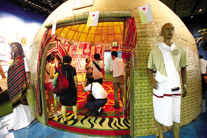 外墻頂部覆蓋著手編織帶,兩壁腰墻和地面分飾有手編掛毯和地毯,內墻上掛有圖案抽象的繪畫和手工藝品,小小民居包羅萬象——一走進非洲聯合館內的吉布提館,就能見一座蝸形民居“浮于水上”。這是吉布提游牧民族阿法爾人的傳統民居,叫“達布瓦塔”。上海世博會上的這個72平方米大小的達布瓦塔,全系在吉布提國內造好再裝進集裝箱漂洋過海而來,所以俱是原汁原味的吉布提當地風情。