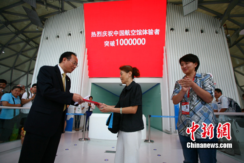 中新網(wǎng)上海8月10日電(記者 陳婷婷)10日,上海世博會(huì)中國(guó)航空館參觀體驗(yàn)總?cè)藬?shù)突破百萬大關(guān)。來自上海寶山區(qū)的陳惠珉女士成為第100萬名幸運(yùn)體驗(yàn)者。世博局浦西DE片區(qū)部陳超部長(zhǎng)親臨現(xiàn)場(chǎng)向中國(guó)航空館迎來第100萬體驗(yàn)者表示祝賀。中國(guó)航空館館長(zhǎng)周俊向陳惠珉女士贈(zèng)送了“中國(guó)航空館第100萬幸運(yùn)體驗(yàn)者”榮譽(yù)證書,以及豐厚且具有航空特色的獎(jiǎng)品。