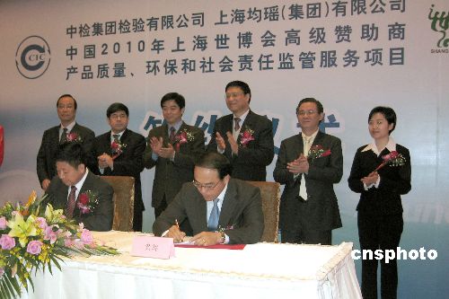 一月十八日,效法北京奧運(yùn)模式,中國(guó)檢驗(yàn)認(rèn)證集團(tuán)有限公司在上海與中國(guó)二0一0年上海世博會(huì)特許產(chǎn)品生產(chǎn)高級(jí)贊助商簽署世博特許產(chǎn)品質(zhì)量、環(huán)保監(jiān)管服務(wù)項(xiàng)目協(xié)議。圖為世博會(huì)高級(jí)贊助商之一的上海均瑤(集團(tuán))有限公司與中檢集團(tuán)簽約。結(jié)合北京奧運(yùn)會(huì)特許產(chǎn)品質(zhì)量監(jiān)控經(jīng)驗(yàn),未來(lái)中檢集團(tuán)將對(duì)上海世博會(huì)各大類(lèi)特許產(chǎn)品實(shí)行原料、生產(chǎn)、加工、管理、包裝及銷(xiāo)售的全流程質(zhì)量控制,包括對(duì)上海世博會(huì)吉祥物“海寶”衍生產(chǎn)品的質(zhì)量監(jiān)控。中新社發(fā) 許曉青 攝