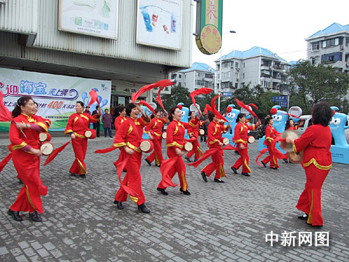 在長青路、成山路口的華聯吉買盛廣場四周,23個2米高1米寬笑容可掬的海寶圍著一圈,不斷地向前來參加活動的志愿者招手致意。一旁,喜慶的龍車上,鑼鼓敲得震天響。廣場中央,來自居民區的志愿者代表和來自社區學校的紅領巾代表集結在一起,他們將迎接海寶到小區。