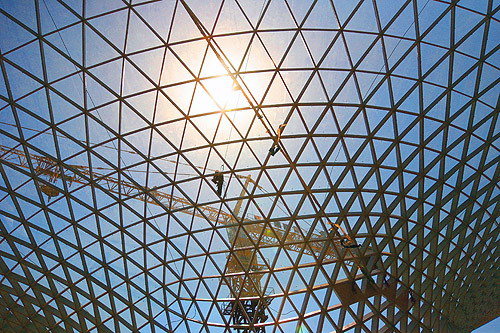 中新網4月30日電 據上海世博會官方網站消息,今天,世博軸上首批兩個喇叭狀的陽光谷正式落成,同時頂棚膜結構張拉啟動,這標志著世博軸上部主體工程即將全面完工。上海世博會執委會專職副主任鐘燕群、上海世博局副局長丁浩等出席儀式。鐘燕群宣布啟動世博軸頂棚膜結構張拉。