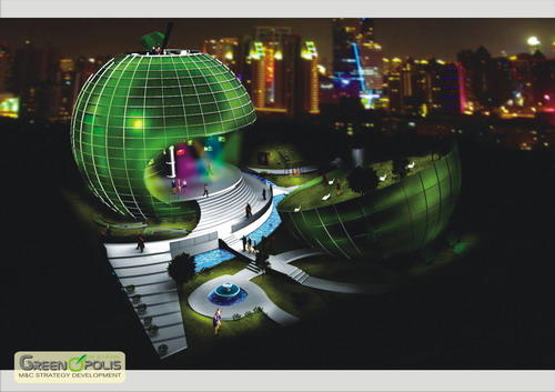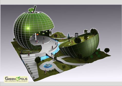 羅馬尼亞國家館的蘋果外形和標志文字“GREENOPOLIS”體現了健康生活方式的重要性、對可持續發展理念的關注以及針對現代社會普遍存在問題的以知識為本的解決方案。