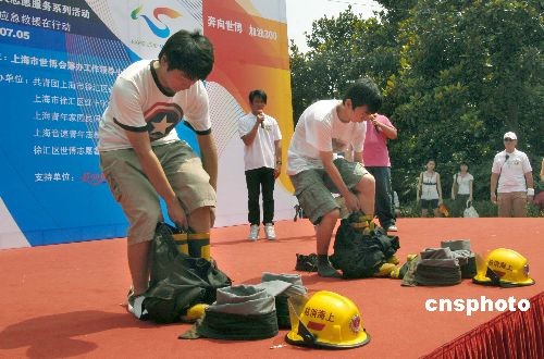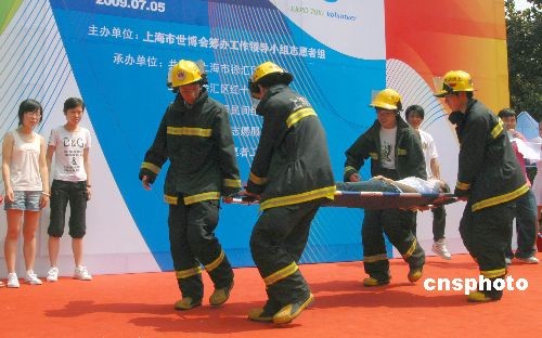 7月5日是中國(guó)2010年上海世博會(huì)倒計(jì)時(shí)300天,“我們?cè)谀闵磉叀笔啦⿻?huì)大型志愿者集中服務(wù)行動(dòng)在申城各街道社區(qū)拉開帷幕,世博志愿者在徐家匯公園進(jìn)行模擬心肺復(fù)蘇應(yīng)急救援演示,活動(dòng)現(xiàn)場(chǎng)還有消防中隊(duì)官兵宣講高樓逃生技巧、滅火器操作方法等,旨在普及、宣傳應(yīng)急救援知識(shí),提高公眾的安全意識(shí)和應(yīng)變能力,保障世博會(huì)游客安全。中新社發(fā) 海牛 攝