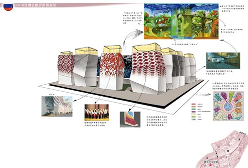 俄羅斯館占地6000平方米,是世博會最大的展館之一。它的外圍是12座不規則形狀的塔樓,聳立于草坪和水景之間,塑造出俄羅斯館傳統與現代相結合的外形。
