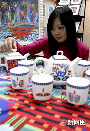 中新網11月24日電(萬軍)為迎接世博會到來,上海金山農民畫院特地開發出系列世博題材創意延伸產品,其中A套以江南傳統繡花鞋為圖案、選用著名的唐山骨瓷為原料,名為“和諧”茶壺(喝與鞋的諧音),B套茶壺蓋則用世博會中國館圖案制成,一經面世,即受到中外人士的關注。
