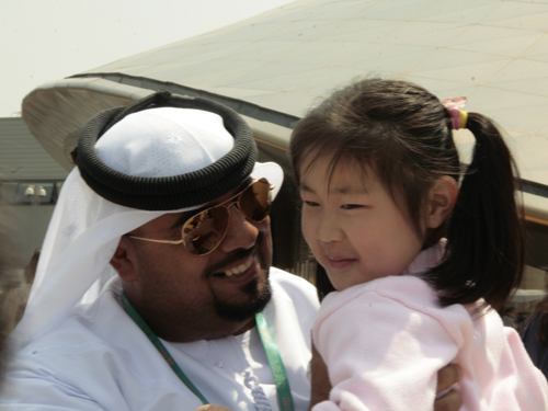 為了緩等待人群的焦急,阿聯酋館的工作人員還和游客互動,抱起了人群中的一個小女孩合照,讓周圍游客開懷不已。