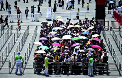 昨日的安檢中,很多游客需開包檢查,相機、筆記本電腦需現場開機,延長了安檢時間。安檢人員說,游客可以帶傘遮陽,但最好不要帶防曬霜等化妝品。