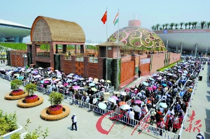 在英國館,10時剛過館前的隊伍已神龍見首不見尾。那隊伍從館前一直繞,繞到了邊上的小花園,繞過了旁邊的公廁。“隊伍的末尾在這兒,排隊的人請盡量往外靠。”工作人員嚷著大嗓門不斷地叫喚,“進園,至少3個小時吧。”她告訴記者。