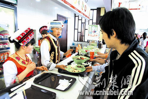 作為普通游客,我們還是首選中美食街。美食街大樓共兩層,呈L形,多是各地名小吃和中西簡(jiǎn)餐。操作程序與武漢的各大美食廣場(chǎng)如出一轍:收銀窗口買(mǎi)卡充值,再持卡到各窗口“刷”,吃完后退卡退押金。價(jià)格比武漢稍貴,約20元-40元即可搞定。