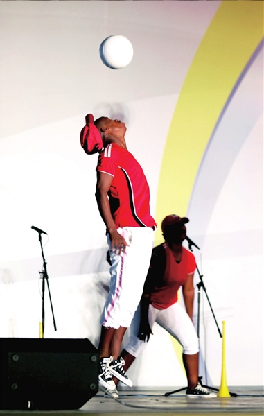 隨后,演員們在非洲廣場跳起南非世界杯的官方舞蹈。6位舞蹈演員身著紅色的南非國家隊隊服,在明快強勁的非洲音樂伴奏下跳起了足球舞,每個動作都跟足球有關(guān),或是頂球、或是傳球、或是顛球……在場的每個人都為足球的激情所感染。