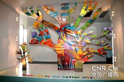 講解員:這個造型是孩子們眼中的城市,它是一個可以挪動的城市,這是一個烏龜,可以拉他們到全世界去跑。