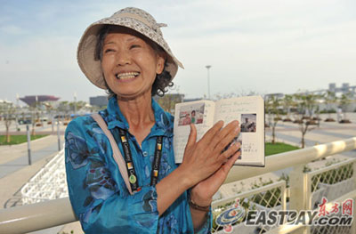 除了要拿上海世博“全勤獎”,山田奶奶或許還可以獲得“最認真游客”的稱號。每天,她都會隨身攜帶一本黃色的“世博日記”,全程記錄自己的行程和遇到的人、事。記者看到,本子上蓋滿了各展館的紀念圖章,還有山田奶奶在各處留下的招牌式的笑容,細心的她還會用筆一一記下合影人的名字。