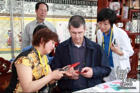 除制瓷以外,參觀寶鋼大舞臺的外國游客還常常熱衷于剪紙、織錦、皮影、旗袍等中國傳統文化,常常盯著一件作品看上老半天,如果碰巧遇上創作演示,更是不看到成品不罷休。每逢這時,獻藝的各位工藝大師總是會熱情地邀請他們親自試一試,剪下一朵花,或畫下一尾魚,體驗中國文化的奇妙。大師們頗有心得地說,語言不是障礙,微笑就是最好的溝通。