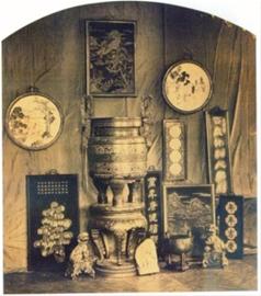 史料記載,1862年世博會上中國的參展規模很小,沒有單獨的展館,只是在主展廳內有一個小小的展區展出一些陶瓷等中國土特產。照片印證了這一點。中國展示的有瓷器、佛像、琺瑯器、寶塔等,還有一張巨幅祖宗油畫。沒有獨立展館,但一個外國孩童正定睛觀看展品,初步顯示了東方藝術獨特魅力。