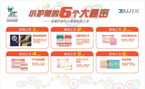 此外,記者了解到,改版后的世博護照還加強了防偽技術。據悉,改版《世博護照》各款產品封面的燙金世博Logo內均采用了超線微縮密碼防偽技術,采用60倍的放大鏡觀看,則可清晰看到EXPO2010字樣。這一通常只用于鈔券的高端防偽技術被運用,標志著世博護照的防偽技術又上一個新臺階,同時也再次提升了世博護照的珍藏價值。