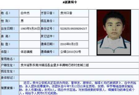 簡介:今年8月2日,公安部發布A級通緝令,懸賞5萬元緝拿在逃犯罪嫌疑人白中杰,他涉嫌參與一個搶劫、殺人團伙。該團伙自今年7月12日以來,在貴陽、安順、畢節等地連續實施搶劫、殺人作案6起,殺死9人。在公安部網站上自2006年1月26日以來公布的25個A級通緝令通緝的犯罪嫌疑人中,白中杰是年齡最小的,是唯一的“90后”。8月4日白中杰被警方抓獲。