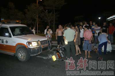 事發(fā)8月17日晚近10時,黃先生說:“太突然了,我一下被撞飛,當時馬上暈過去了。”當晚,他和幾個同事在江濱路大排檔吃完飯后,分乘兩輛摩托車沿江濱路由東往西行駛,他開的摩托車上載著同事周女士。途經洋老洲游泳池附近時,黃先生突然感到后面有車撞來,他和周女士被撞倒并被往前面推行了10多米,接著他就暈過去了。