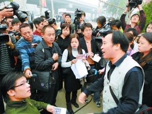 在昨天審理肖傳國一案的同時,法院大門外也上演著一場“庭審”:接受肖氏術(shù)的患者和家屬以及肖傳國的支持者都自稱自發(fā)來到法院,形成兩個鮮明陣營,將原本在網(wǎng)上互相發(fā)帖拍磚的論戰(zhàn)搬到了這里。