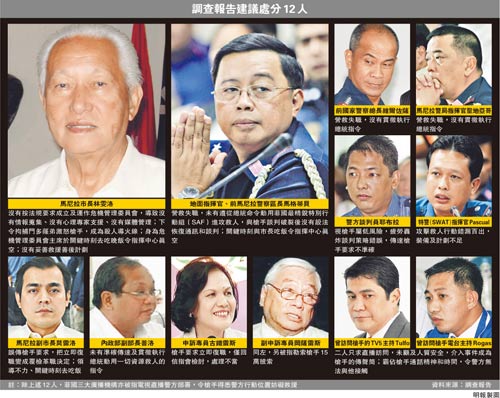 阿基諾三世昨在記者會上透露,調查報告建議他對12名官員及傳媒工作者作行政或刑事檢控,包括市長林雯洛、內政部副部長普洛、正副申訴專員、前警察總長、談判專家、特警指揮官及當日與門多薩做直播訪問的電臺節目主持人等。
