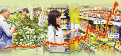 供港的平價衣履、耐用品、日常用品及食品多數靠內地進口,倘人民幣升值,香港進口商向內地供貨商取貨時,以港元計的進口價勢必上升。其中,香港大部分食品由內地入口,人民幣匯價攀升,加上原材料、運輸費用上漲,直接導致香港百物騰貴。港九罐頭洋酒伙食行商會理事林國坤指出,日前接獲內地供貨商的通知,即日起調整來貨價,大部分肉類罐頭批發價最少加價10%,以反映內地生產成本及人民幣升值的影響,相信當香港零售商的存貨售清后,市面零售價會相應上調。