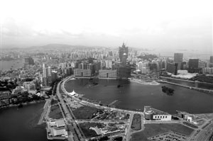 圖為西灣湖畔葡京、永利、星際、金沙、美高梅賭場(chǎng)連成一片。 中新社發(fā) 史利 攝