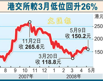 大摩將港交所的投資評級降至“表現遜于大盤”,大削目標價43%至120元,指近期股價反彈提供了沽貨獲利的機會。該行稱,雖然港交所股價已從低位回升,但港股平均每日成交額卻仍維持于800至900億元。意味今年盈利增長將較弱,港交所目前的2008年預測市盈率為27倍,高于其它上市交易所的19至20倍。
